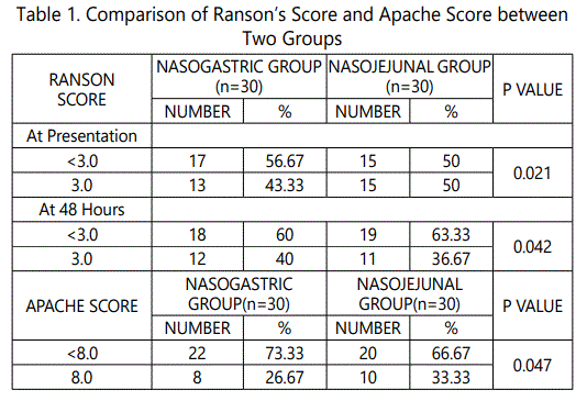 Results: The mean age group of the study subjects was 36.34 (range 22-64) years. The gender distribution showed 30(100%) males in nasogastric group 28(93.33%) males and 2(6.67%) females in nasojejunal group. Duration of hospital stay was statistically lesser in nasojejunal group as compared to nasogastric group (p = 0.05). 9(30%) patients in the nasogastric group and 3(10%) patients in nasojejunal group required to stay in the ICU. 2(6.67%) patients in nasogastric group and 1(3.33%) in the nasojejunal group required surgical intervention in the form of necrosectomy.