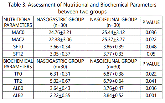 The Midarm circumference(MAC) and triceps skin fold thickness(SFT) and total protein(TP) and serum albumin(Alb) were measured in all patients at the end of one week, after receiving enteral nutrition. All parameters had decreased from the baseline in the nasogastric group as compared to nasojejunal group (Table 3).