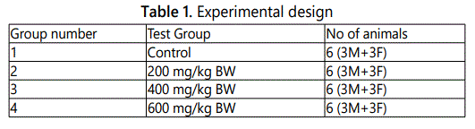 Repeated oral toxicity (sub acute) study in Wistar albino rats (28 days) were conducted as per the OECD Guideline 407 [5]. Procedure: The test substance was orally administered daily in graduated doses to several groups of experimental animals, one dose level per group for a period of 28 days. During the period of administration, the animals were observed closely, each day for signs of toxicity. Animals which die or are killed during the test are necropsied and at the conclusion of the test surviving animals were killed and necropsied.