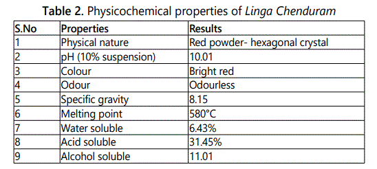 Physical nature, pH (10% suspension), Colour, Odour, Specific gravity, Melting point, Water solubility, Acid solubility and Alcohol soluble were studied [2,3]. The XRF analysis of Linga chenduram was done in Central Electro Chemical Research Institute, Karaikudi.