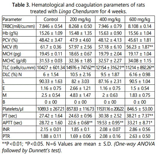 From the results of hematological study, it is confirmed that the 28 days of treatment with Linga Chenduram there was significant increase (P<0.01) in the level of TLC and Prothrombin time. In contrast, the APTT and MCV level is gradually decreased. They are closely related to normal control (Table 3).