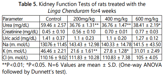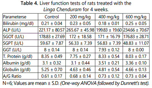 In the liver function test, there was a mild change in the parameters but it is not statistically significant (Table 4). The result of RFT shows in table 5. After 28-day treatment of Linga Chenduram the urea and potassium levels decreased (P<0.01) in the animals given 200 & 400 mg/kg dose level. But there were no significant alterations produced in the other parameters like creatinine, uric acid, sodium and chloride levels.