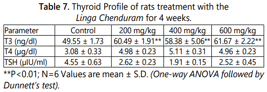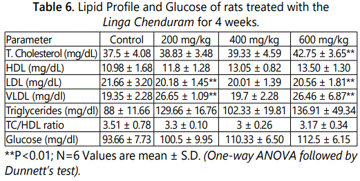 Table 6 indicates the Linga Chenduram effects on lipid profile in which the total cholesterol, LDL, and VLDL were affected (P<0.01). The LDL range is significantly altered but it is nearly equivalent to that of control.