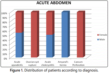 All patients underwent surgical treatment with single incision laparoscopic surgery technique. Laparoscopic single port appendectomy was applied to the patients diagnosed as acute appendicitis. Laparoscopic single port cholecystectomy was applied to the patients diagnosed as acute cholecystitis. The patient who has caecum perforation, was treated by the laparoscopic caecum repair with the primary sutures and laparoscopic single incision appendectomy was added to this procedure. One patient with ovarian cyst rupture was taken to surgery and laparoscopic single port cystectomy with drenage was applied. The other patient with ovarien cyst rupture, was treated by laparoscopic right tubo oophorectomy from the single umblical incision. The treatment of the amyand hernia was performed intraperitoneally; primary repair by laparoscopic dissection and reduction after appendectomy and contraction of internal orifice. There was no intraoperative complication in any of the cases.