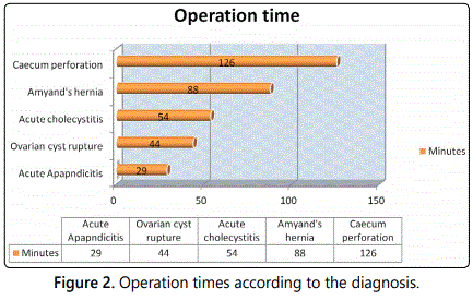 The mean operation time was 40 minutes (appendectomy: 29 minutes-cecum repair: 129 minutes). All patients were discharged the next day, except 3 patients with postoperative infection. The patient who underwent appendectomy and developed postoperative infection, was discharged on the postoperative 5th day and the patient with caecum perforation was sent home on the 7th postoperative day (Figure 2).