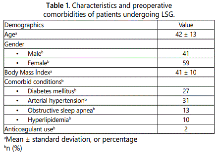 Methods: Morbidly obese patients who underwent standard technique of LSG with using fibrin sealant were included in the study. Data concerning patient demographic variables [age, gender, body mass index (BMI, kg/m2), and comorbid conditions], previous surgeries, postoperative complications and postoperative readmissions were collected.
