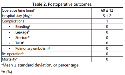 Postoperative complications are shown in table 2. One patient presented with abdominal pain after discharge and was treated with medical treatment. The patient did not require any intervention and there was no mortality. The bleeding rate was 1%, and bleeding was spontaneously stopped by clinical follow-up. On postoperative day 6, the patient was discharged. There were no other complications in the first follow-up period of all operated patients.