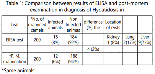 In conclusion: The results of this study indicated that hydatidosis is of great public health and economic significance in the governorate of Assuit. Detection of hydatid cysts in the slaughtered camels abattoirs and its improper disposal will act as a source of infection to final host (mainly dog) and transmission to human beings. Accordingly, conducting public campaign is urgently required to control this disease through destruction of stray dogs, prohibiting illegal slaughter of animals outside abattoirs, proper disposal of infected organs, fencing of slaughterhouses and increase awareness of the people on the epidemiology of the disease. Identification of infected animals during their life could facilitate slaughtering them under special control measures which ensure total condemnations of their infected tissues and eliminate the random arrival of the cysts to dog, the matter which play the role to minimize the infection in dogs and wide spread of the diseases. Moreover it is necessary to mention that, control measures of hydatidosis must be carried on parallel to that of human beings, also against the definitive host and the other intermediate ones. It can be also concluded that ELISA should be considered not as an alternative but as a useful addition to the range of immunodiagnostic tests available for serodiagnosis of hydatid