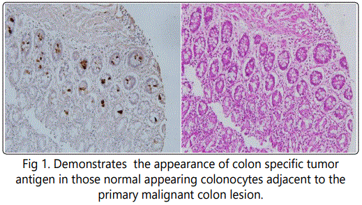 A detailed analysis of the three major monoclonals we had produced against colon cancer antigen revealed that all had the capabilities of inducing a strong ADCC response. This appeared to be the primary mechanism for targeting tumor rather than induction of cytotoxic T cells. Similarly, these mAbs showed a high degree of specificity and sensitivity for the diagnosis and presence of tumor when employed in a serum ELISA. Using Immunohistochemistry (IHC) to define expression of antigen in the tissue under examination, it was found that those cells that had undergone initial genotypic changes, could for the first time, be clearly identified by antigen expression, even though the phenotypic features of cancer were not yet available for recognition by routine pathologic examination [6] Studies to date have suggested that many of the normal appearing colonocytes adjacent to a malignant lesion, have for the most part undergone genotypic transformation (Fig.1) and are expressing tumor antigen while appearing normal phenotypically.