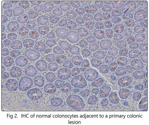 Obviously during resection of a primary colon lesion by colectomy, it is essential for the pathologist to guarantee that transformed colonocytes if identified, not be left behind in the margins of resection that are to be incorporated in the anastomosis. This now appears to be best achieved by employing IHC with those monoclonal antibodies targeting colon tumor antigen along with the standard H&E protocol. Normal appearing colonocytes at the margin of a colon cancer resection H&E of normal adjacent to colon ca case #1 NPC1-C 5ug/ml on case #1 which was read as benign.