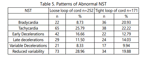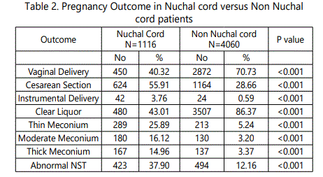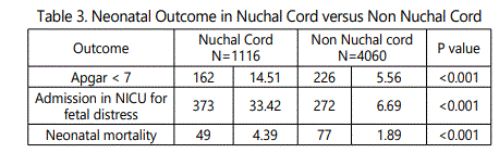 Conclusion: Nuchal cord is associated with varying degrees of intrapartum complications such as fetal heart rate irregularities, meconium staining, low Apgar scores, increased cesarean sections and increased incidence of neonatal admissions in intensive care unit. Antenatal and intrapartum vigilance is imperative for positive pregnancy outcomes.