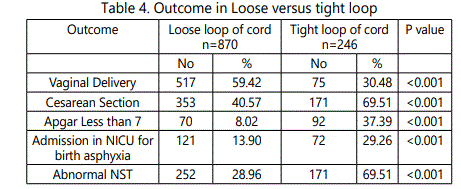 Baergen, et al [28] found that as many as 20% of stillbirths at autopsy are due to fatal compromise of umbilical circulation. Parast et al, for the first time established evidence of placental histologic criteria for umbilical blood flow restriction (cord accident) in unexplained stillborns [29]. Present study found that neonatal mortality was 4 times higher in nuchal cord. A nuchal cord at the onset of labor is very unlikely to correct itself. It hardly matters whether the cord is wrapped around the neck, or the shoulder or the leg, the outcome can be the same. Everything may be fine throughout the entire pregnancy; however, at the time of delivery, as the foetus moves into the birth canal, the cord can become stretched or compressed. All of these problems are rare and unfortunate but natural processes. It is the task of the obstetrician to recognise the signs of foetal distress and to act swiftly before the reduction in oxygenation causes permanent injury [30]. Tight cord have poorer neonatal outcome as compared to loose cord and need more vigilance.